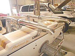 CASTLE HEADERS Custom built Headers for a Big Block Chev in a Speed Boat. Headers are made from Stainless Steel with 2 1/4in Primaries 4in merge-Collectors and 6in Stainless packed Mufflers.